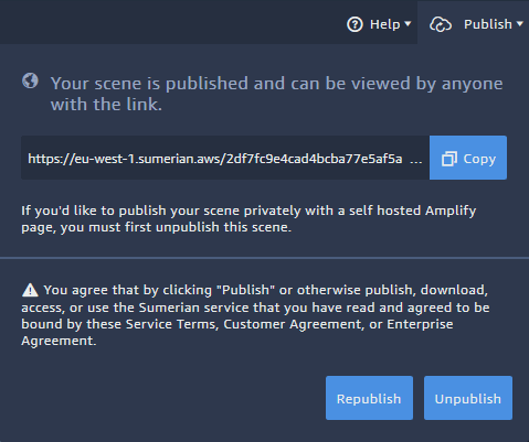 The next step is to publish your scene. This assigns a unique, public URL to your project, which you can use to test & view the scene outside of the Sumerian editor. The URL isn’t automatically included in any listing – it’s up to you to share the URL with friends and colleagues to test and to showcase your project.