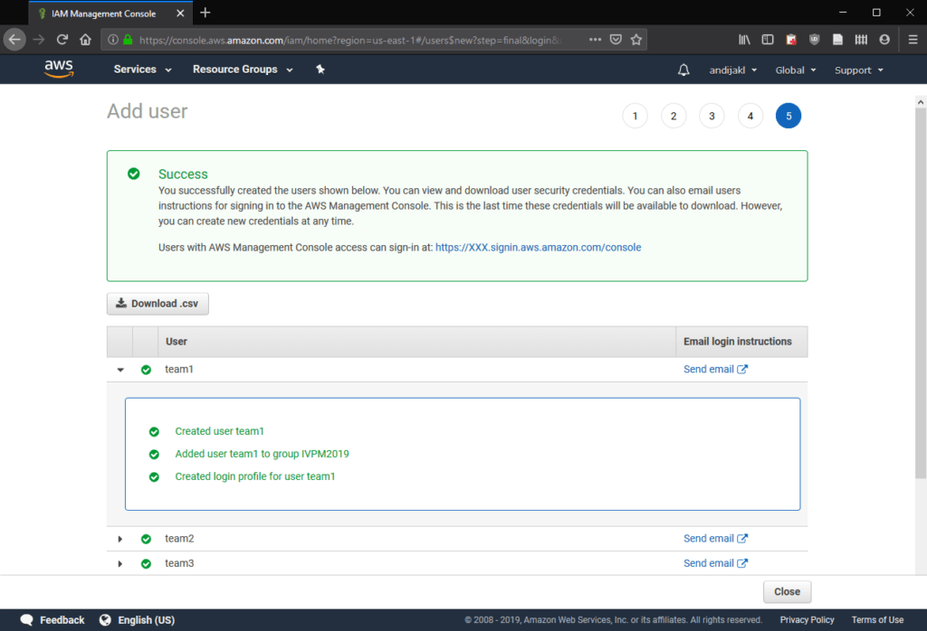 You don’t need to assign any tags and can then finalize user creation. On the success page, be sure to note the AWS Management console access URL from the green box. The users in the list are the account names for the log-in. In case you had auto-generated passwords selected, this is also the best chance to retrieve and write down the passwords for each team.